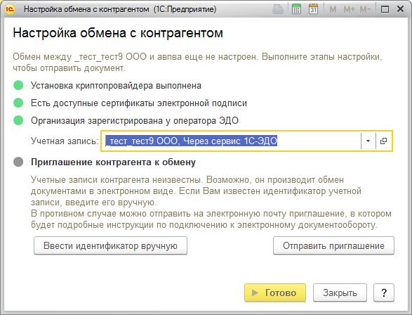 Можно начать настройку обмена электронными документами с контрагентом не из форм настроек, а с помощью удобного мастера настройки, который откроется при создании электронного документа из документа учета.