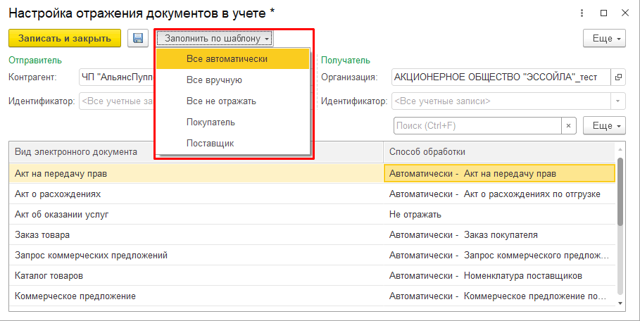 Для быстрой настройки способов отражения предусмотрено меню Заполнить по шаблону. В меню представлено несколько вариантов быстрой настройки: Все автоматически, Все вручную, Все не отражать, Поставщик (отключает автоматическое отражение документов покупателя, например Заказ товара), Покупатель (отключает автоматическое отражение документов поставки, например Товарная накладная, Ответ на заказ).