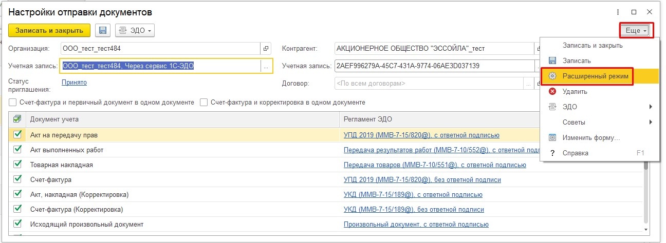 Данный режим позволяет использовать настройки отправки разных способов обмена электронными документами. Включить режим можно, открыв меню Еще и выполнив команду Расширенный режим.