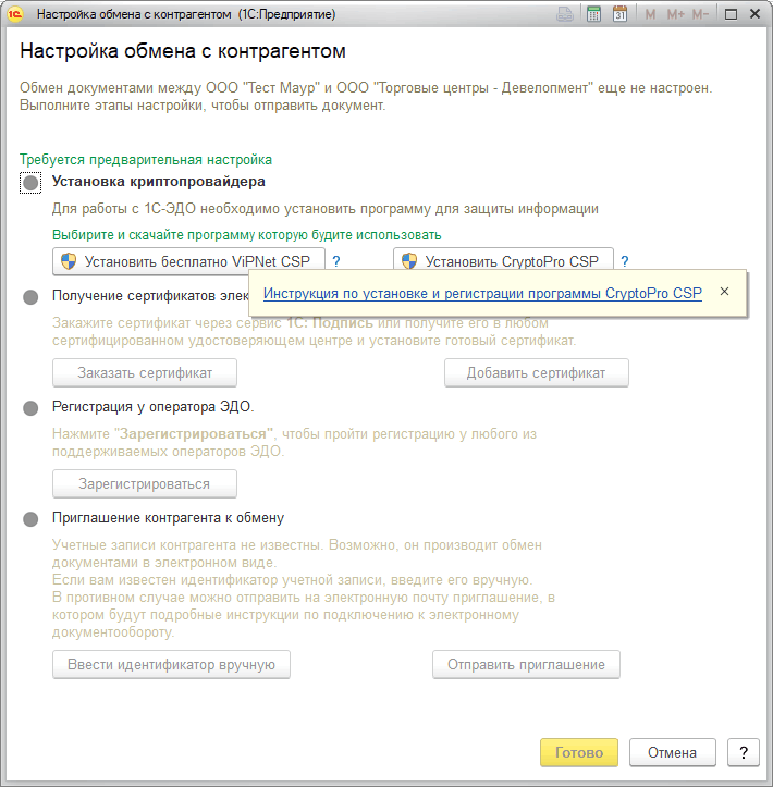 Обмен через оператора ЭДО возможен только при применении электронных подписей и выполненных настройках криптографии.