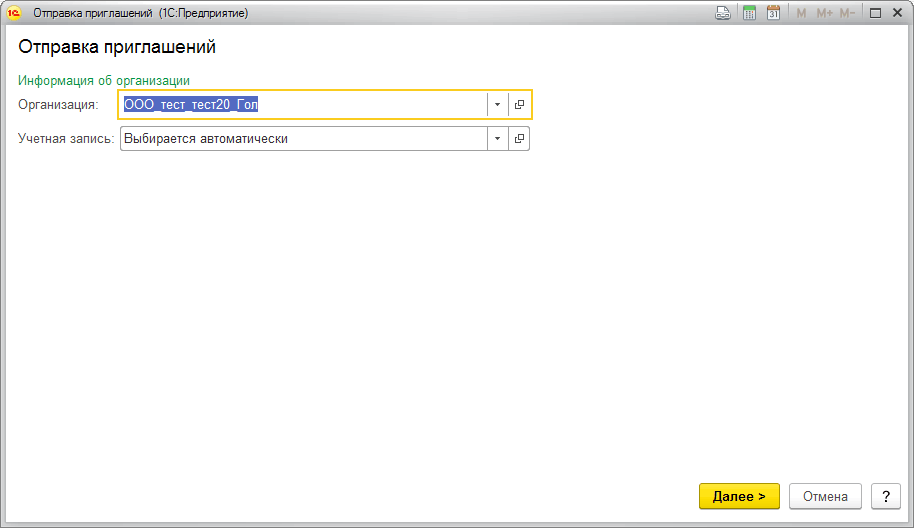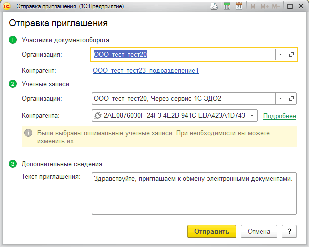 При отправке приглашений сразу нескольким контрагентам откроется помощник массовой отправки приглашений. На первом шаге помощника необходимо указать, с какой учетной записи отправлять приглашения. Если учетных записей несколько, то можно воспользоваться автоматическим подбором.