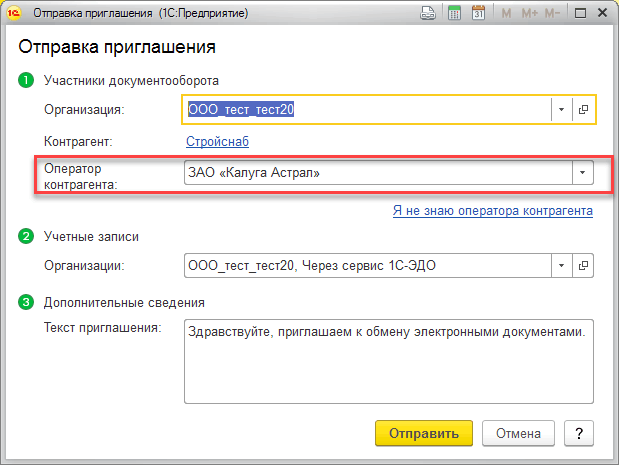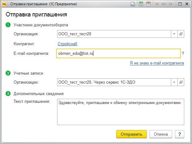 Если идентификатор неизвестен, то необходимо указать либо оператора ЭДО контрагента, либо электронную почту, на которую будет направлена инструкция по подключению к сервису ЭДО.