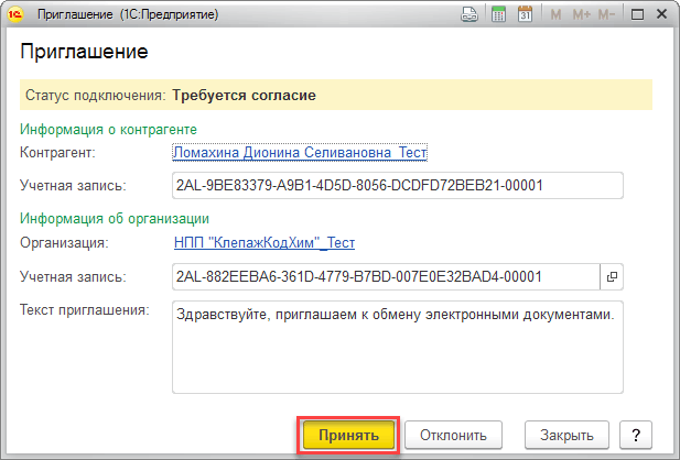 Чтобы одобрить входящее приглашение к обмену электронными документами, необходимо выбрать соответствующую команду формы – Принять.