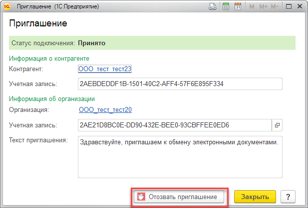 В дальнейшем отказаться от обмена с конкретным контрагентом возможно в любой момент времени. Для этого, перейдя в приглашение, необходимо выполнить команду Отозвать приглашение.