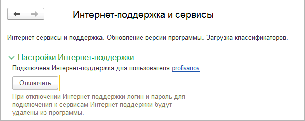 При нажатии Отключить логин и пароль учетной записи пользователя портала 1С:ИТС будут удалены из программы.