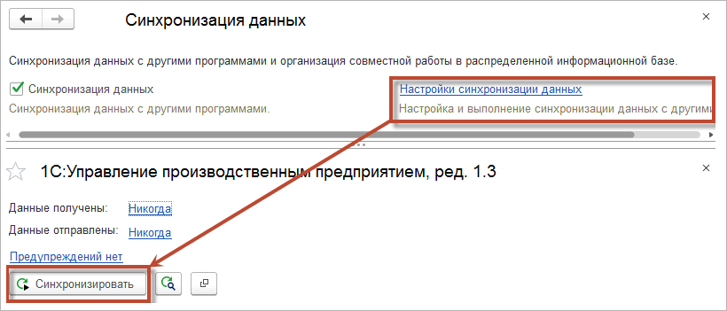 Для синхронизации данных вручную надо открыть форму по команде Настройки синхронизации данных в разделе Администрирование – Синхронизация данных и нажать на кнопку Синхронизовать.
