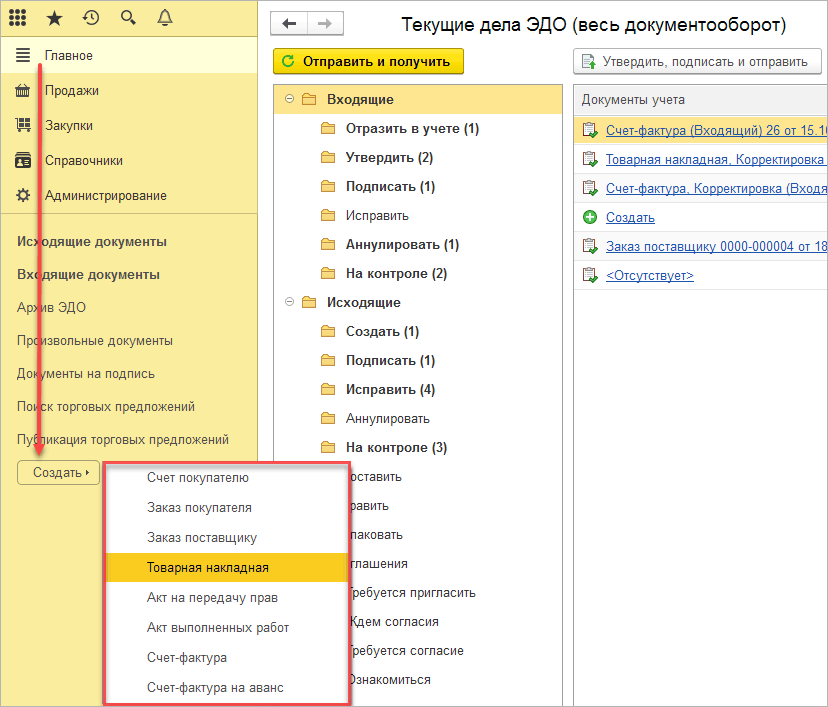 ■ группа Создать содержит перечень документов информационной базы, для которых необходимо сформировать электронные документы. Для выделенных в списке элементов доступны команды Создать, подписать и отправить и Создать электронный документ;