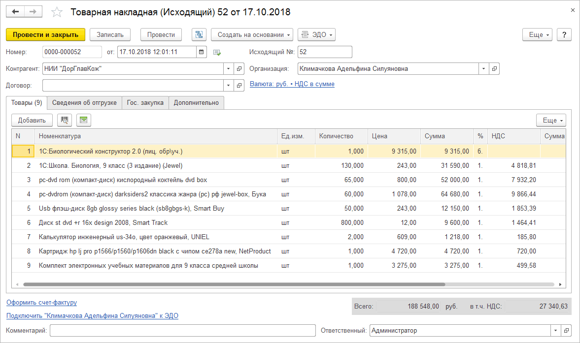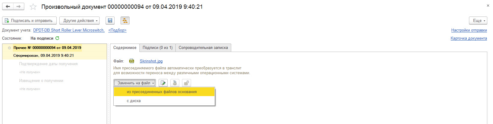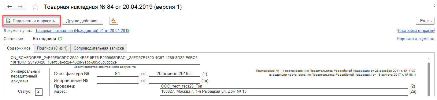 Если при обмене задано требование ответной подписи на этом же экземпляре электронного документа, то в форме документа можно установить электронную подпись на электронный документ (если у текущего пользователя есть право подписи) по команде Подписать и отправить или передать его на подпись ответственному лицу по команде Утвердить (если нет права подписи или электронная подпись не применяется вовсе).