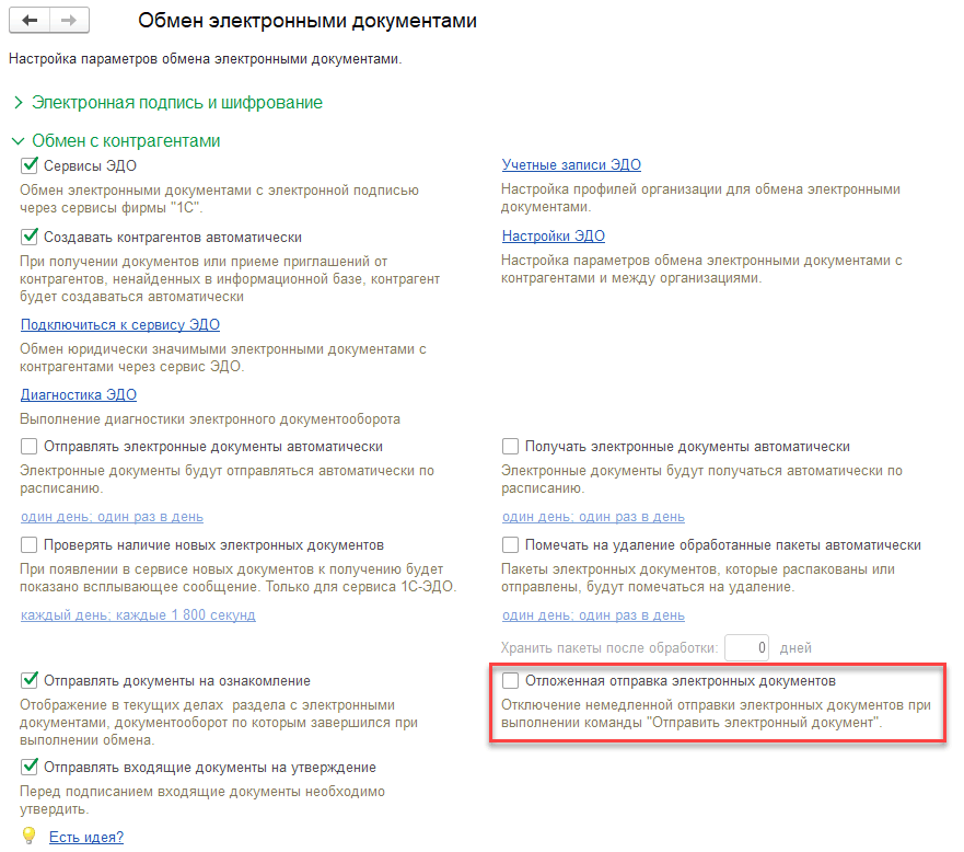 Момент передачи подготовленных к отправке электронных документов зависит от значения опции Отложенная отправка электронных документов, задаваемого в настройках программы. Если эта настройка включена, то передача исходящих данных осуществляется по команде Отправить и получить электронные документы в Текущих делах ЭДО либо с помощью регламентного задания Отправлять электронные документы автоматически. Если же настройка выключена, то передача исходящих данных запускается автоматически после постановки в очередь на отправку, при этом пользовательский интерфейс может оставаться недоступным на время сеанса передачи данных.