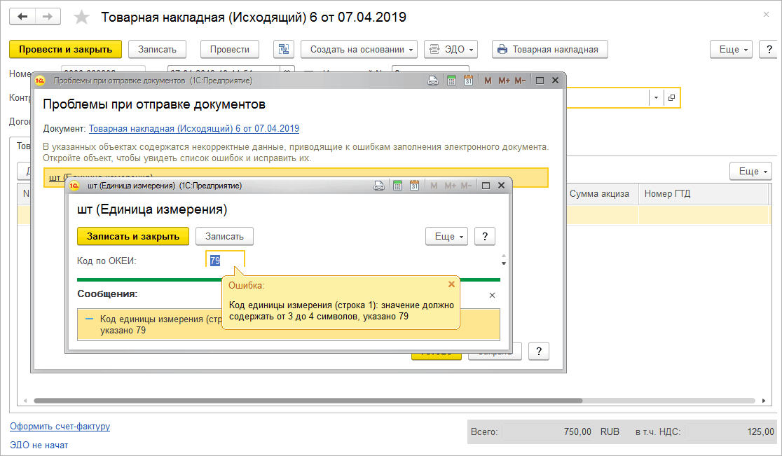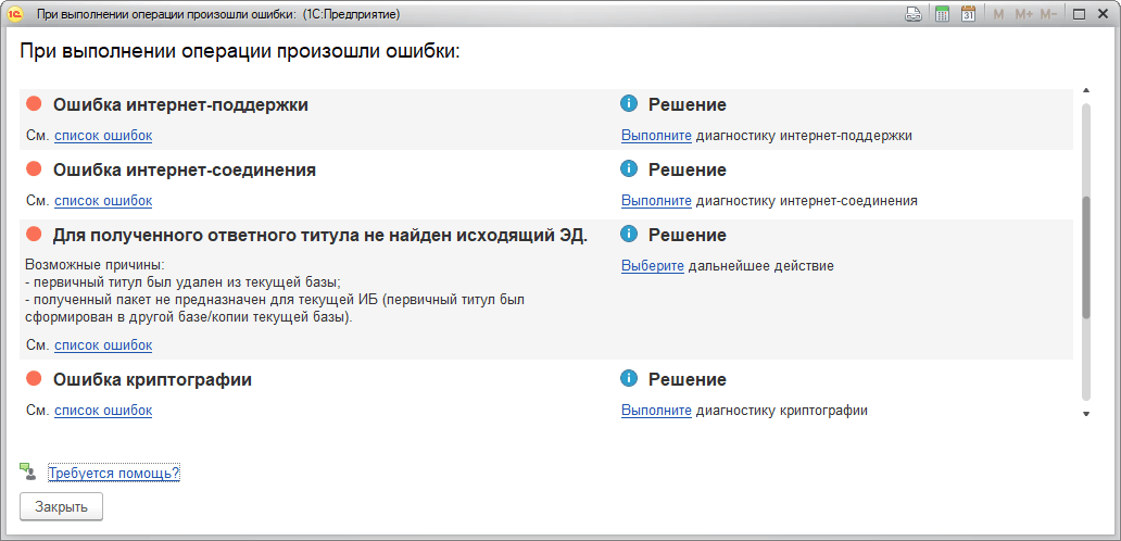 При возникновении проблемной ситуации в процессе работы с электронным документооборотом открывается форма со списком ошибок и способами их решения.