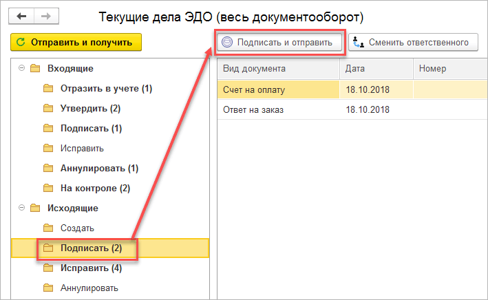 ■ группа Входящие содержит входящие электронные документы, для которых требуются действия с нашей стороны, например утвердить или подписать. Для выделенных в списке элементов доступна команда Утвердить, подписать и отправить;
