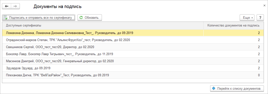 Если пользователь имеет возможность подписывать электронные документы двумя и более сертификатами, то в форме будет содержаться список всех сертификатов электронных подписей, которые установлены на компьютере и доступны для подписания текущему пользователю, а также количество подписываемых электронных документов по каждому сертификату. В форме можно подписать все электронные документы по сертификату (по команде Подписать все по сертификату). При этом указать пароль к закрытой части ключа электронной подписи нужно будет только один раз (аналог операции «подписать каждый документ в пачке своей подписью одним нажатием»).