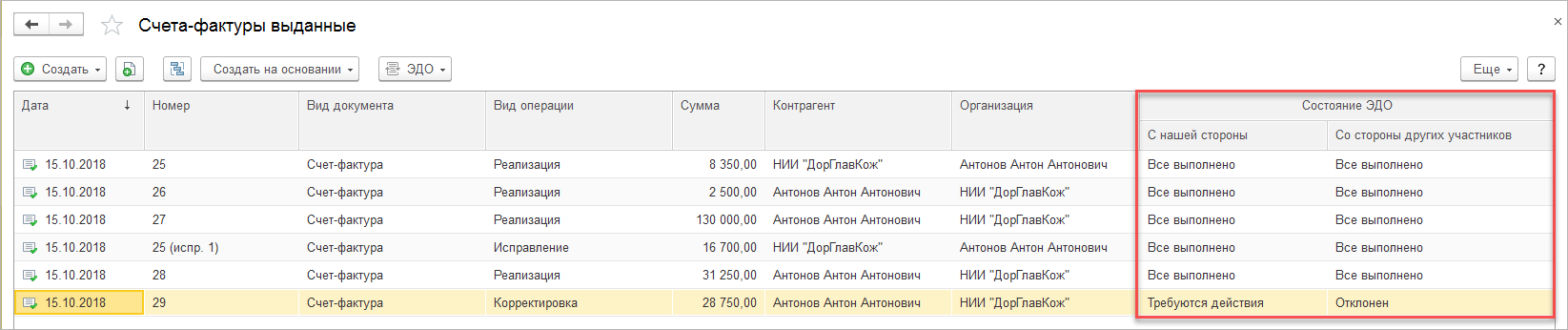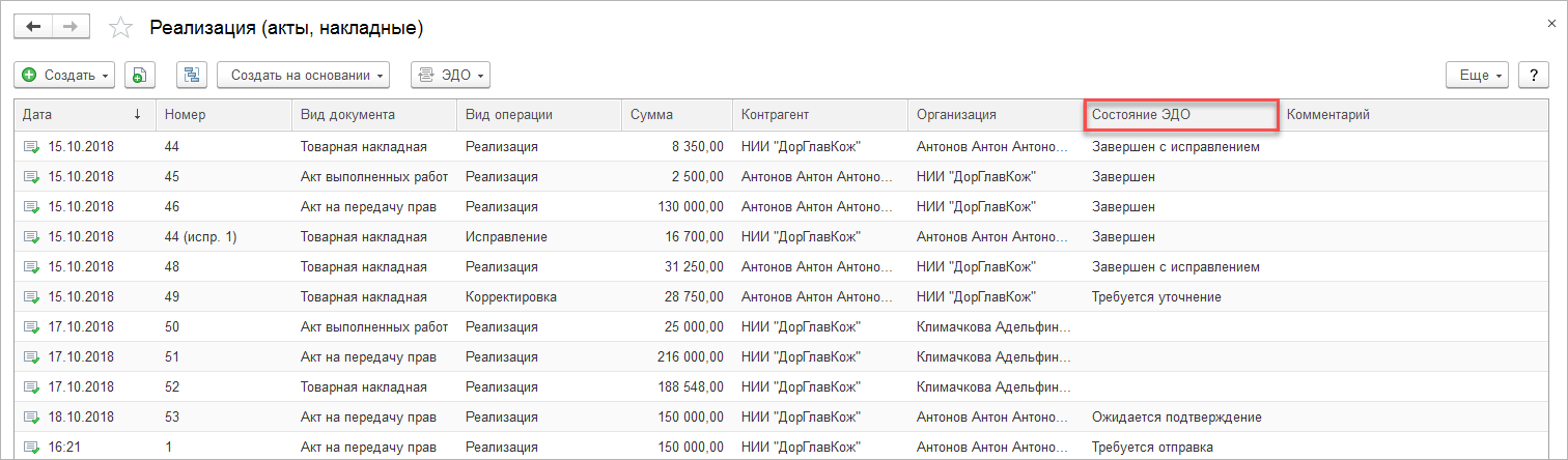 Также текущее состояние электронного документа отображается в форме списка документов (колонка Состояние ЭДО) и изменяется автоматически.