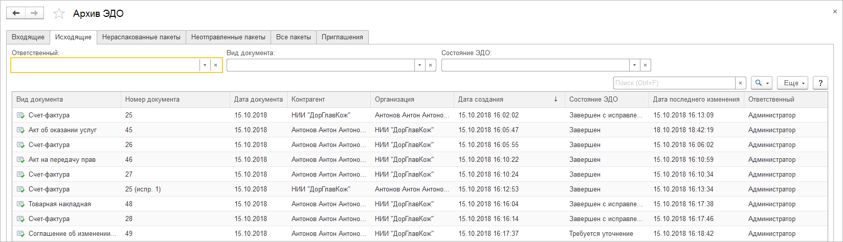 После формирования все электронные документы попадают в архив электронных документов на страницу Исходящие документы. В списке архива можно установить отбор по ответственному, виду и статусу электронного документа, открыть для просмотра форму электронного документа. Архив может открываться по команде Главное – Архив ЭДО.