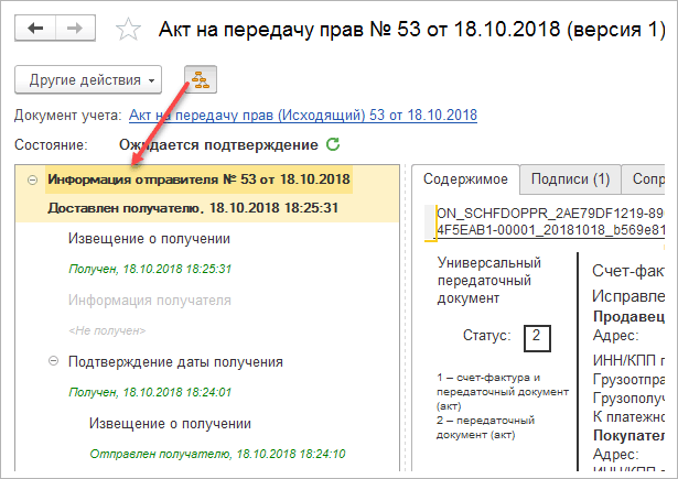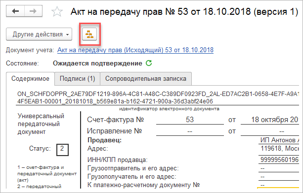 Подробную информацию о том, какие действия необходимо выполнить пользователю со своей стороны, а также о требующихся действиях со стороны других участников можно увидеть в дереве формы Электронные документы, открываемой по команде в панели навигации формы документа или по гиперссылке Состояние ЭДО.
