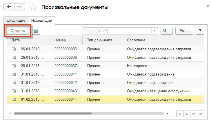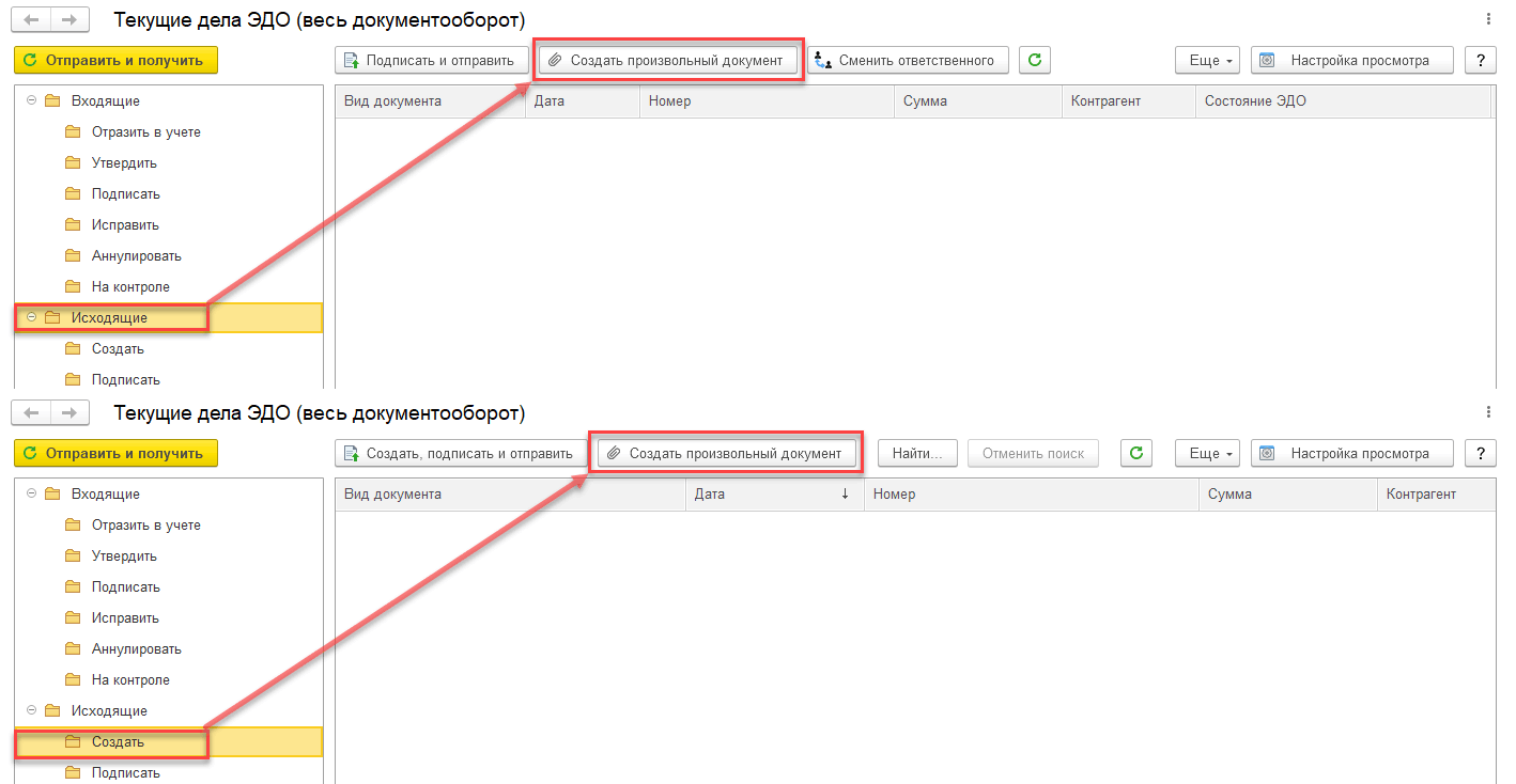 Произвольный документ может быть создан из «Текущих дел ЭДО» (группа Исходящие, подгруппа Создать).