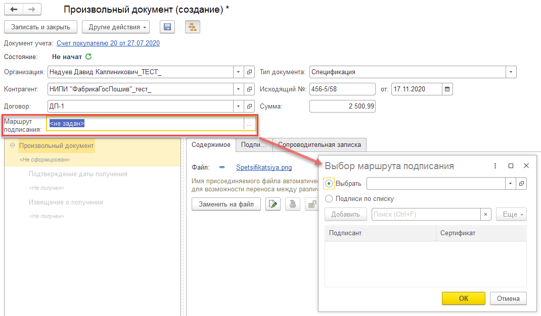 Если в настройках регламента ЭДО для произвольного документа указан маршрут подписания Указывать при создании документа, обязательным для заполнения будет также поле Маршрут подписания. Можно выбрать маршрут из справочника Маршруты подписания, а можно – список подписантов (пользователь и при необходимости сертификат электронной подписи), каждый из которых должен установить на документе подпись.