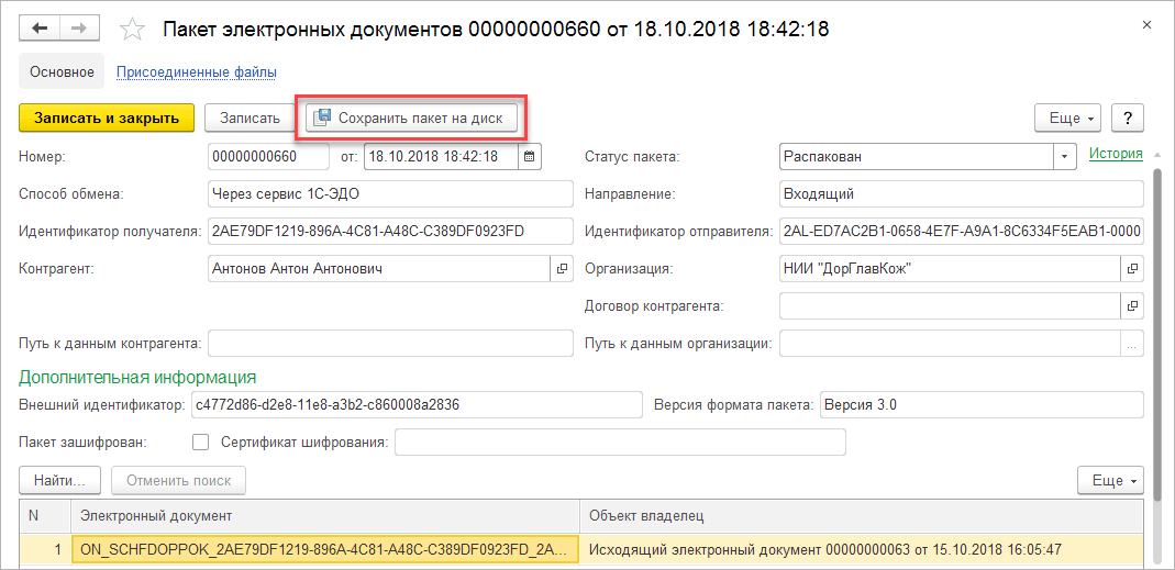 Для некорректных пакетов, которые вызывают ошибку в процессе распаковки, можно установить статус Отменен (без обработки) и выяснить причину ошибки, сохранив файл пакета электронных документов на диск по команде Сохранить пакет на диск из формы документа Пакет электронных документов (групповое сохранение файлов пакетов доступно для пользователя с полными правами через команду Еще – Сохранить пакет на диск на закладке Все пакеты).