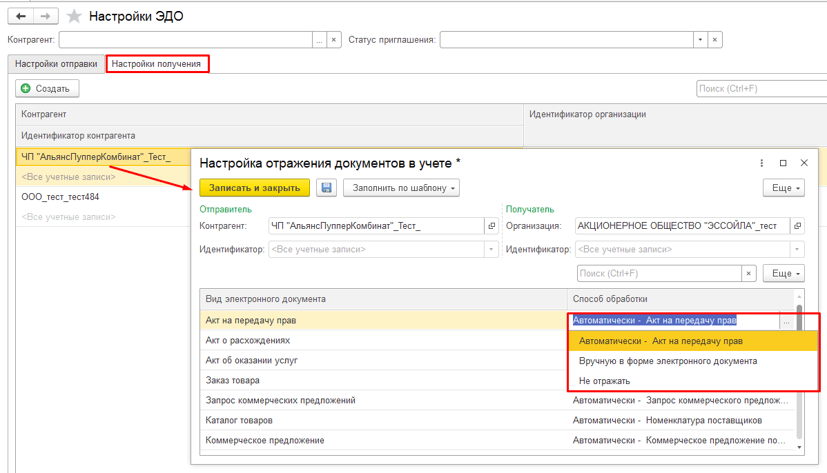 В зависимости от настроек (Администрирование – Обмен электронными документами – Настройки ЭДО – Настройки получения) электронный документ может отражаться в учете при получении автоматически либо вручную. Также существует возможность отключить отражение в учете.