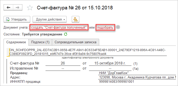 В форме электронного документа доступны команды Создать и Подобрать. Команда Создать позволяет ввести новый документ учета. Команда Подобрать открывает форму подбора документа учета, в которой доступно не только создание нового документа, но и привязка к существующему документу учета.