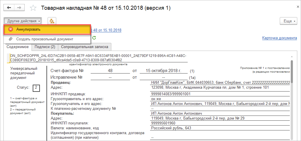 Электронные документы могут быть аннулированы по взаимному согласию сторон. Аннулировать электронный документ можно из формы просмотра документа (меню Другие действия, команда Аннулировать). В результате выполнения команды появится окно для ввода причины, далее сформируется служебный электронный документ Предложение об аннулировании, который после подписания электронной подписью будет отправлен другому участнику обмена.