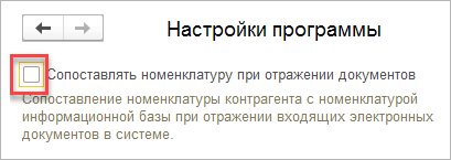 Для отключения сопоставления номенклатуры контрагента с номенклатурой информационной базы при отражении входящих электронных документов необходимо снять флажок Сопоставлять номенклатуру при отражении документов в настройках программы (Администрирование – Настройки программы).