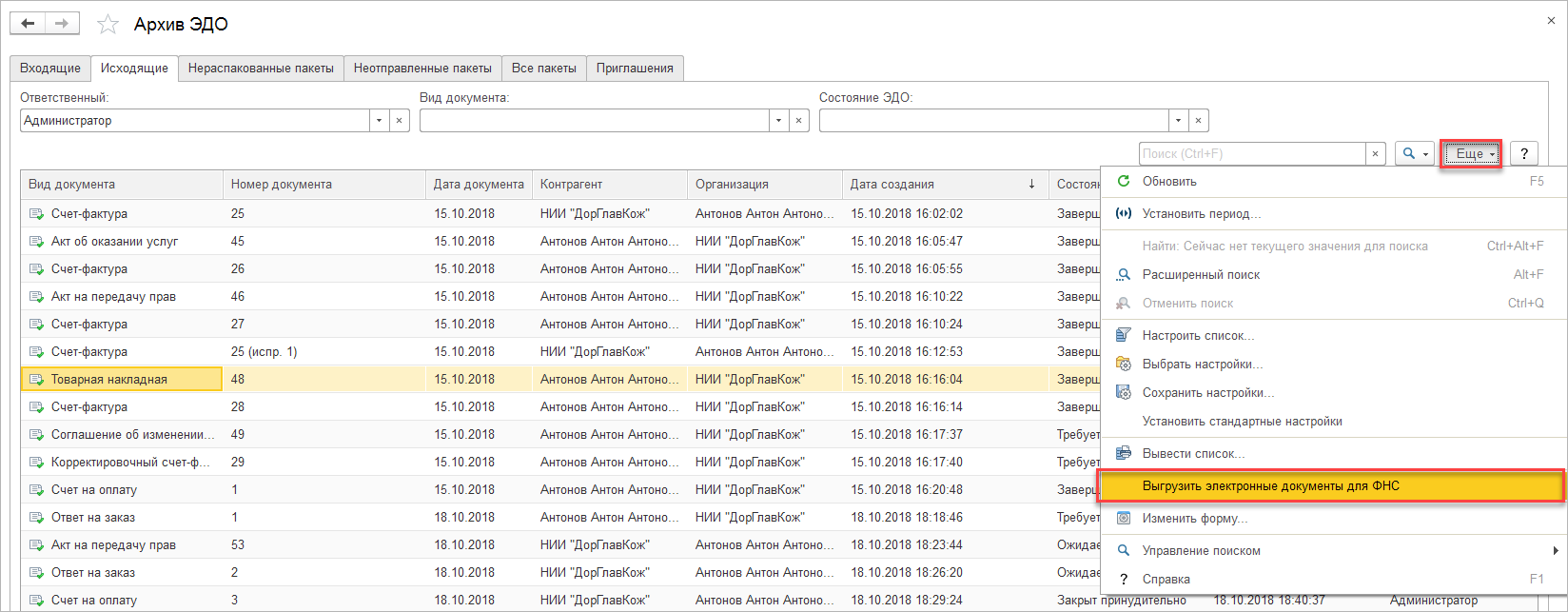 Для того чтобы сформировать файл выгрузки электронных документов для ФНС, нужно открыть Архив ЭДО, в меню Еще (на вкладках Исходящие или Входящие) выбрать Выгрузить электронные документы для ФНС.