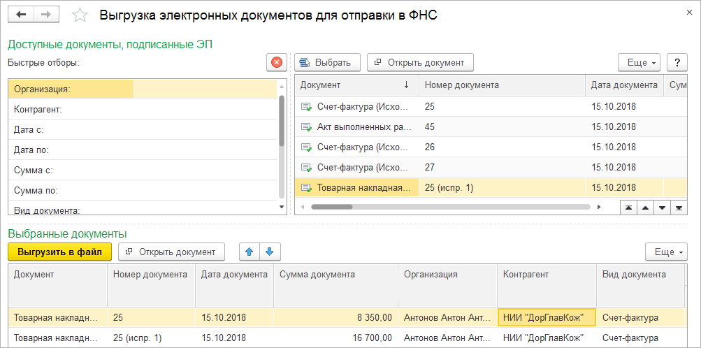Откроется форма подбора электронных документов и выгрузки в файл:
