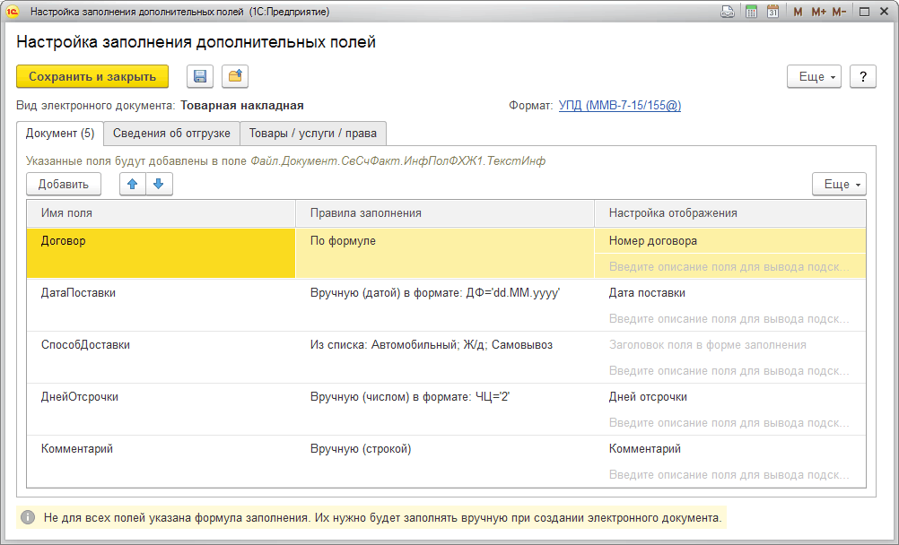 Форма конструктора дополнительных полей позволяет определить состав и правила заполнения полей для соответствующего раздела формата электронного документа. Настройки можно задать как для всего документа, так и для каждой строки его табличной части, со следующими правилами заполнения: вручную (строкой/датой/ числом), из списка, по формуле.