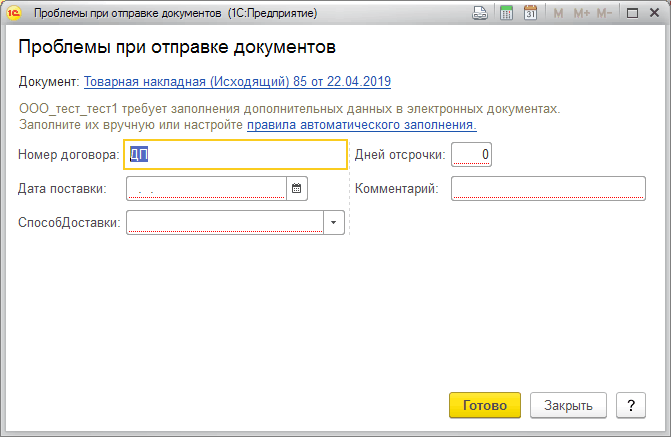 Если в форме конструктора в качестве правила заполнения указана формула, то значение будет автоматически рассчитано и подставлено при формировании документа. В случае, когда установлен другой вариант правил или при вычислении формулы произошла ошибка, значения дополнительных полей необходимо заполнить вручную. Информация об этом отображается в форме Проблемы при отправке документов при попытке сформировать документ.