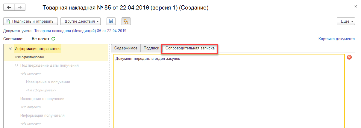 На форме просмотра электронного документа можно добавить сопроводительную записку – для этого надо перейти на закладку Сопроводительная записка в подвале формы и ввести текст записки. В отличие от комментария текст сопроводительной записки передается вместе с электронным документом получателю. Текст сопроводительной записки можно редактировать в исходящем документе до момента отправки. В отправленных и входящих электронных документах текст сопроводительной записки недоступен для редактирования.