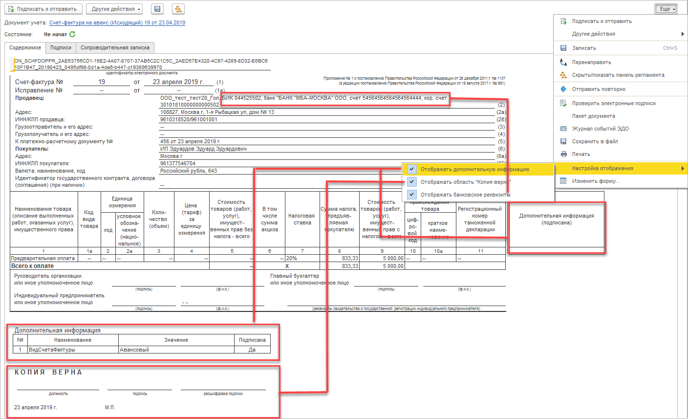 В форме электронного документа возможен вывод дополнительной информации. Режим вывода области задается при помощи подменю Еще – Настройка отображения (подробнее см. в разделе «Печать электронных документов»).