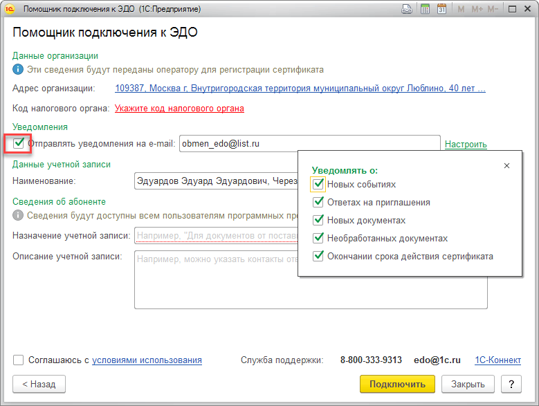Для включения уведомлений необходимо в помощнике подключения к сервису ЭДО указать адрес электронной почты, на который будут присылаться уведомления.