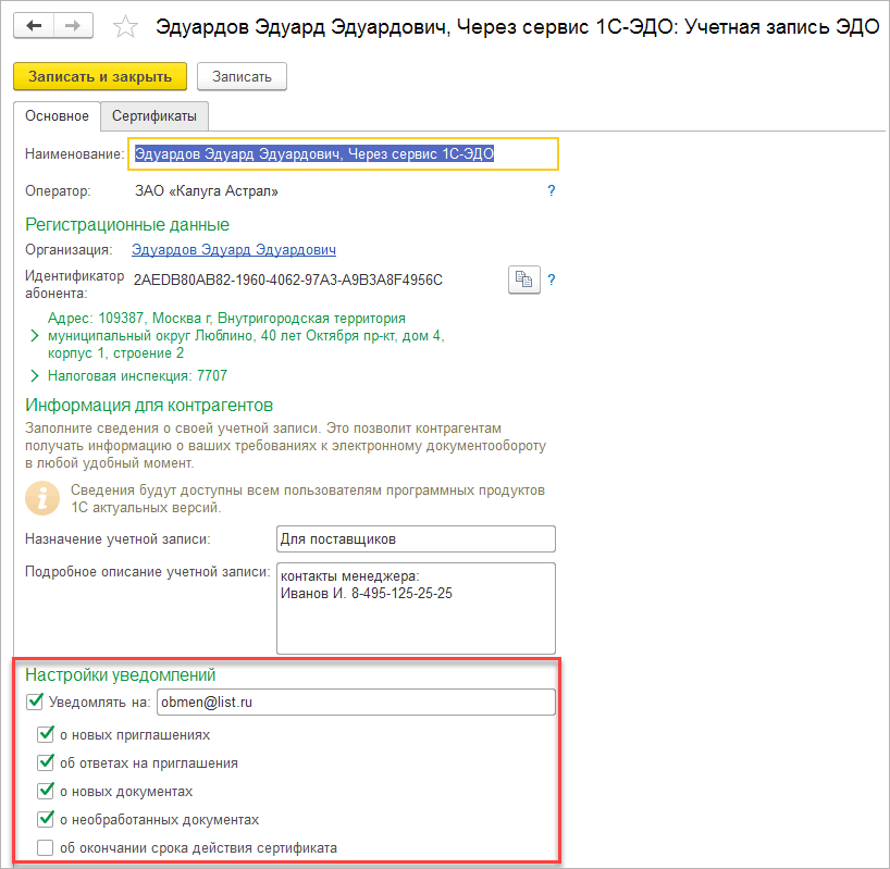 Для настройки уведомлений в существующей учетной записи ЭДО необходимо перейти в форму Учетные записи ЭДО.