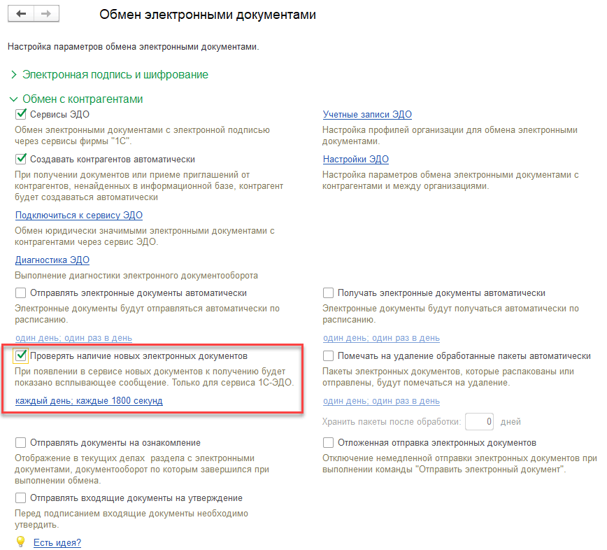 Для включения уведомлений необходимо в настройках обмена контрагентами (Администрирование – Обмен электронными документами – Обмен с контрагентами) установить флажок Проверять наличие новых электронных документов и настроить расписание проверки наличия новых электронных документов.