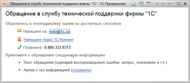 При возникновении неизвестной ошибки (то есть для ошибки отсутствует известное решение) будет предложено обратиться в службу технической поддержки с возможностью приложить к обращению файл с технической информацией, необходимой для расследования ошибки.