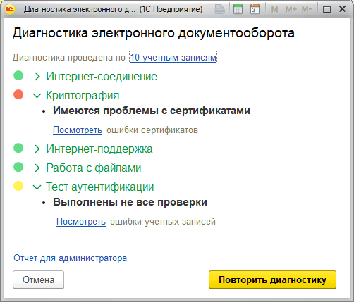 Одним из инструментов устранения проблем является мастер диагностики, позволяющий выполнить диагностику электронного документооборота.