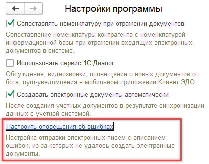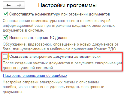 Возможность установить флажок автоматического создания электронных документов зависит от настроек оповещения об ошибках. К ним можно перейти по соответствующей гиперссылке.