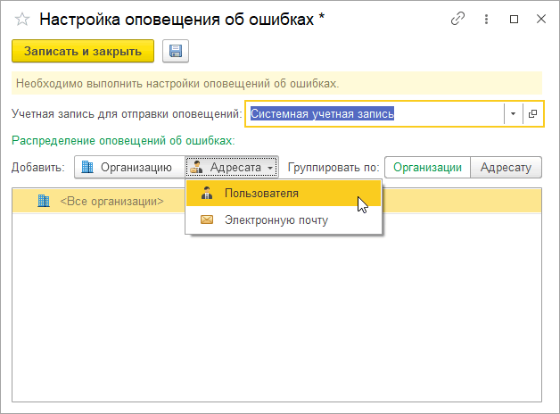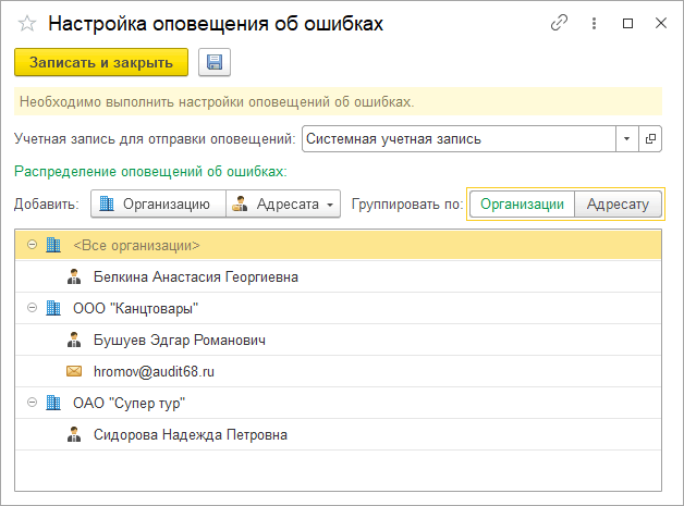 ■ Распределить оповещения об ошибках по организациям и адресатам (пользователям информационной базы или адресам электронной почты).