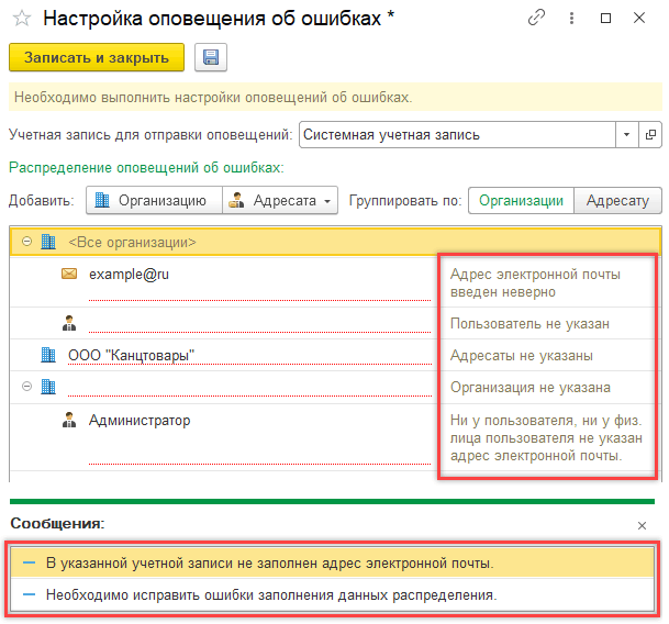 При вводе данных и при сохранении настроек выполняются проверки заполнения и корректности учетной записи и данных распределения оповещений об ошибках.