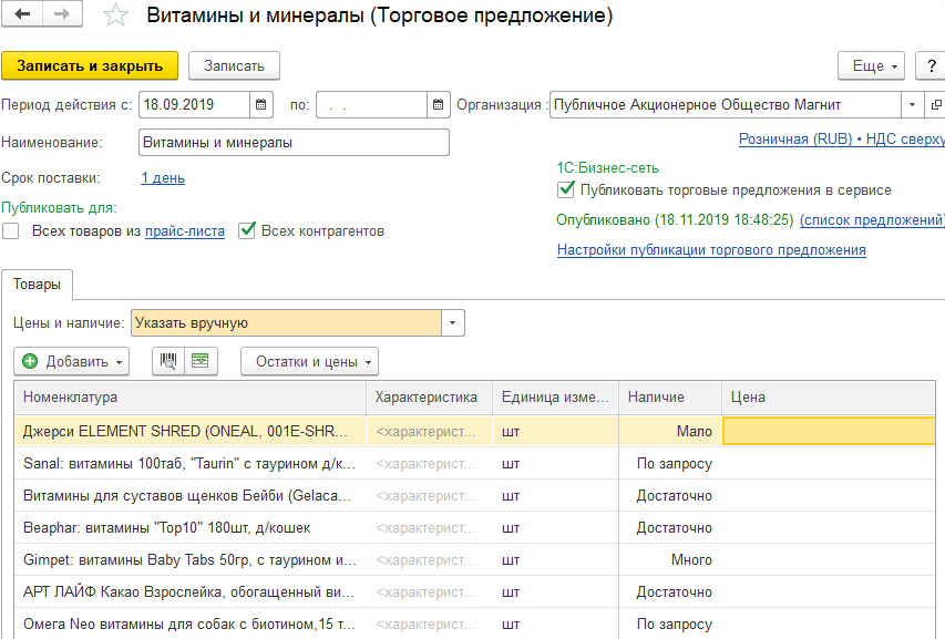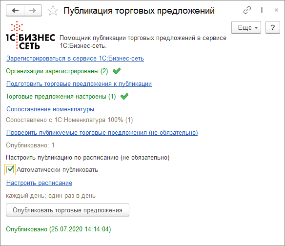 ■ Требуется синхронизация – публикация торгового предложения в сервисе «1С:Бизнес-сеть». Если торговое предложение успешно опубликовано, то гиперссылка сменится на информационную запись Опубликовано с указанием даты публикации.