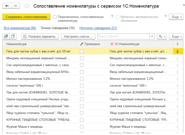 ■ сопоставить товар с сервисом «1С:Номенклатура».