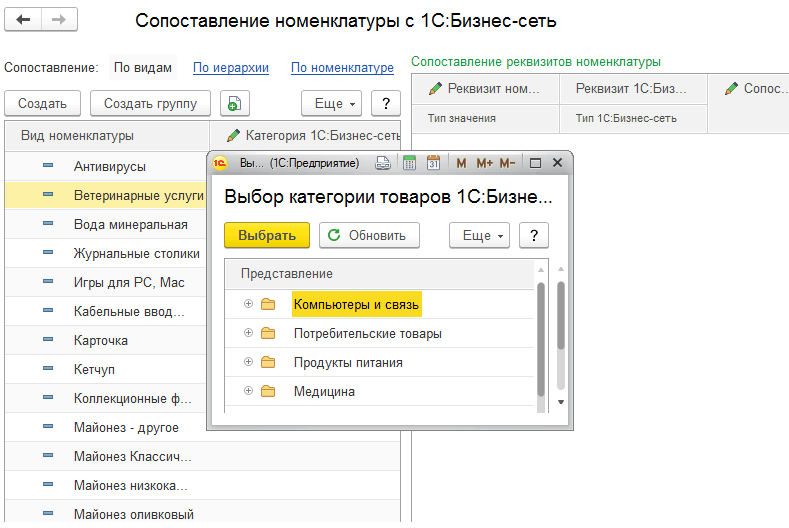 ■ Сопоставление по видам номенклатуры – для видов номенклатуры информационной базы можно сопоставить категории товаров рубрикатора. При публикации товары по сопоставленным видам номенклатуры будут выгружаться в соответствующую рубрику в сервисе «1С:Бизнес-сеть».