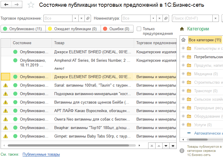 При выгрузке позиций торговых предложений возможна публикация товаров в определенных категориях рубрикатора «1С:Бизнес-сеть». Возможно сопоставление по видам номенклатуры, иерархии справочника номенклатуры и по номенклатуре. Если для вида номенклатуры или иерархии выполнено сопоставление, значение сопоставленной категории отображается для элемента номенклатуры в режиме сопоставления по номенклатуре, при этом категорию сопоставления для текущей строки номенклатуры можно изменить.
