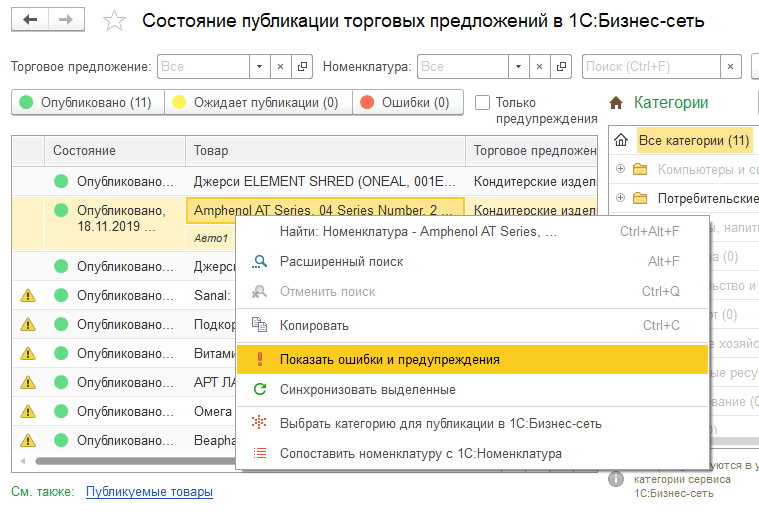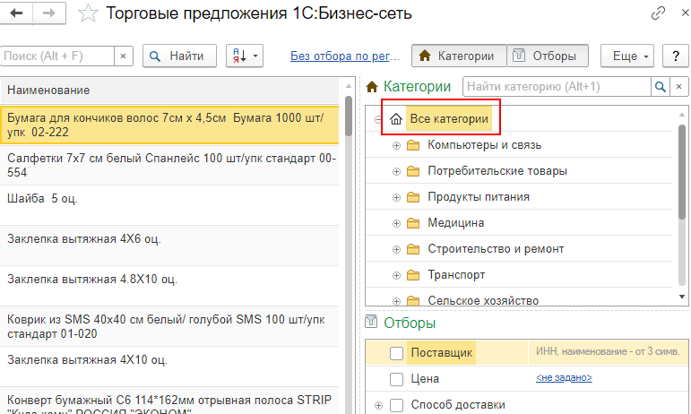■ с категориями рубрикатора сервиса «1С:Бизнес-сеть».