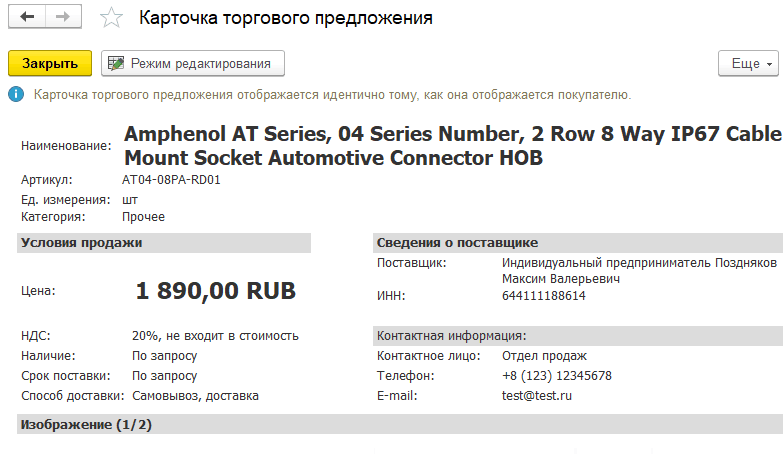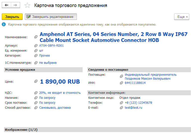 После изменения данных карточка будет переформирована с учетом внесенных изменений. В случае если товар сопоставлен с сервисом «1С:Номенклатура», сведения о товаре будут указаны исходя из данных сервиса. Редактирование сведений о таких товарах недоступно, при этом редактирование сведений о контактной информации и ценах будет доступно.