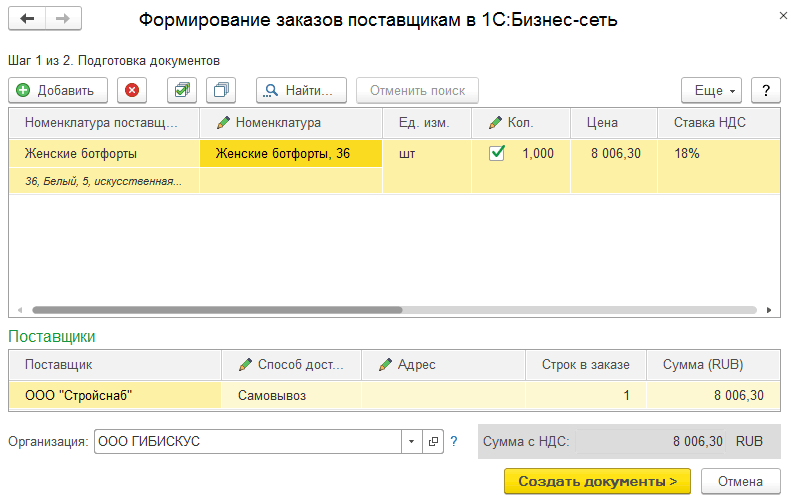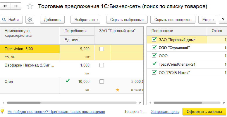 Непосредственное добавление отобранных торговых предложений производится с использованием корзины заказа. Для удобства в момент формирования заказа (электронных документов) торговые предложения автоматически группируются по поставщикам.