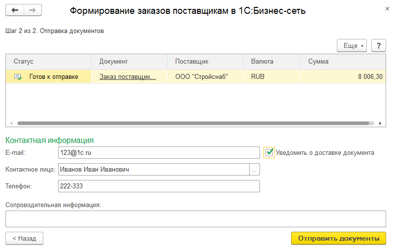 ■ Включение/отключение опции Уведомлять по эл. почте о статусе заказов, заполнение контактной и сопроводительной информации. В форме отражается список электронных документов заказов со статусом Готов к отправке. Предусмотрен переход в табличную форму электронного документа заказа для внесения корректировок.