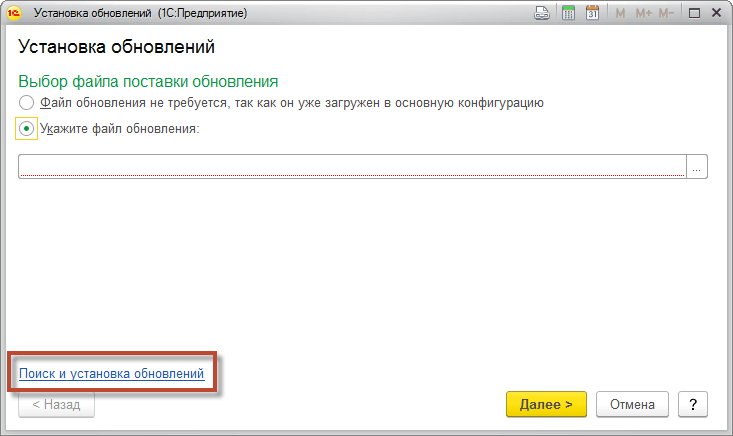 Помощник установки обновлений позволяет провести обновление из файла обновления в локальном, сетевом каталоге (например, с диска 1С:ИТС) или выполнить автоматический поиск обновления в Интернете.