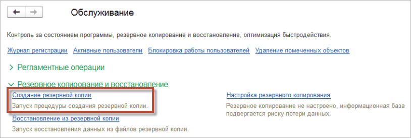 С целью уменьшения риска потери данных администратору системы необходимо регулярно выполнять резервное копирование ИБ. Частота создания резервных копий зависит от интенсивности ввода новых данных в ИБ.